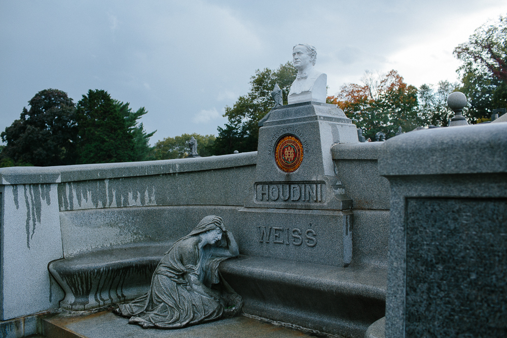 Still the world’s best known escape artist, he died on Halloween in 1926 and was interred at the tomb that, just ten years earlier, he’d had built in memory of his parents. It’s here, in the rain, that we spend the next hour—sitting on the exedra, examining the grave markers of the ten people buried in the plot and taking in the history of what surrounds us, attempting to communicate with the beyond while we wonder if there is actually any beyond to communicate with, Scharinger, Azada, and I sharing the two bottles of wine (the other two don’t drink). The whole time, the woman weeps and Harry watches us. Beneath him, there’s a mosaic of the symbol of the Society Of American Magicians – its vivid red, orange and yellow tiles the only color in the whole scene – and under that, both his surnames are inscribed boldly into the stone, Houdini first and Weiss below it, the rain darkening their names the more it falls.“I find it fascinating,” says Bradley, “that this is not his real name. It’s his character name that became him. He wants to be known as Harry Houdini. He wants to be known as somebody completely different that he’s created, that isn’t his real name. And is that supposed to be his mother? Look it up!”