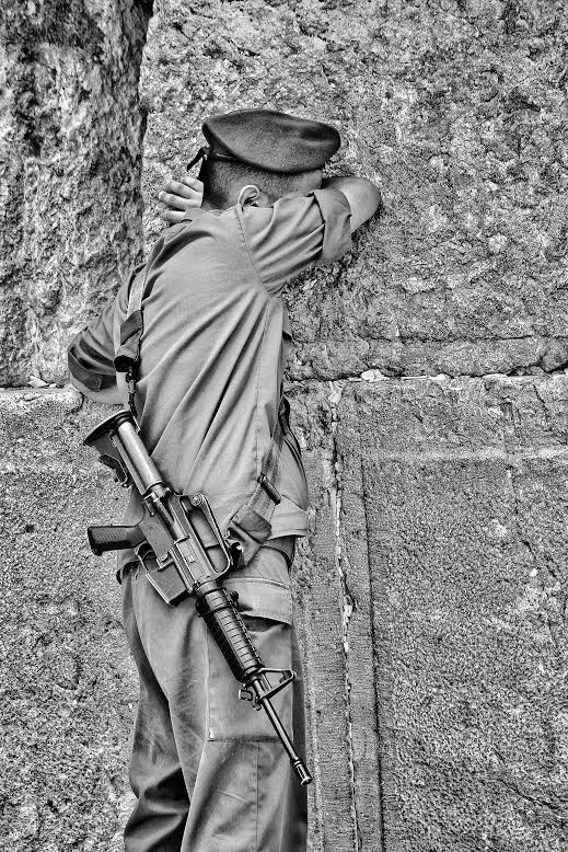 Photographs like this tend to be interpreted as being “loaded”; often people want to dissect them for some specific socio-political subtext, but there is none here (unless someone else besides myself inserts their own, and there is nothing I can do about that). I am not a Jew, Muslim, Hindu, Catholic, or Buddhist, but I have taken many, many photos of followers of all of those faiths praying in their holy places across the globe, and every single one has been beautiful to me, just as this one is– they are all shots of individuals searching outside of themselves for something. The fact that the man is holding a deadly weapon that has been rendered basically useless makes the picture even more beautiful to me. And what is the man praying for… peace with Palestine? The health of his ailing mother? The death of his enemies? The strength to get through the heartbreak of his girlfriend leaving him for another man? We simply do not know; that is between him and his God. I quickly took the photo and walked away, leaving him alone with his thoughts.