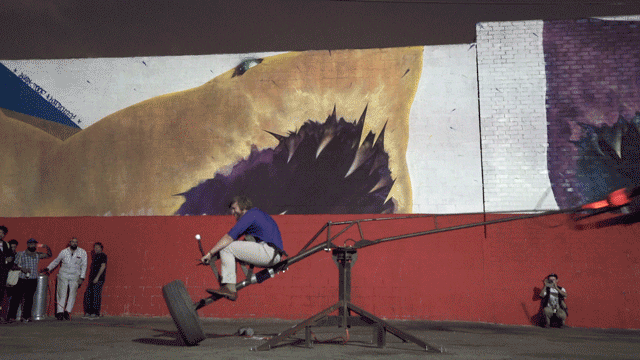 The SoCal metropolis is less friendly to things that sound like explosions than Doyle’s current home base. It was at the gallery opening that we saw The Regurgitator in action. “The Regurgitator is a pulse jet-powered spinning centrifuge that you ride in,” Doyle explains. “As you spin around it literally pulls the contents of your stomach out using g-force and sends them into the crowd in a flying ring of vomit while you’re doing 7-10 g’s and starting to go unconscious.” In an interview in 2010, Doyle told us that around 35% of people ride until they throw up.