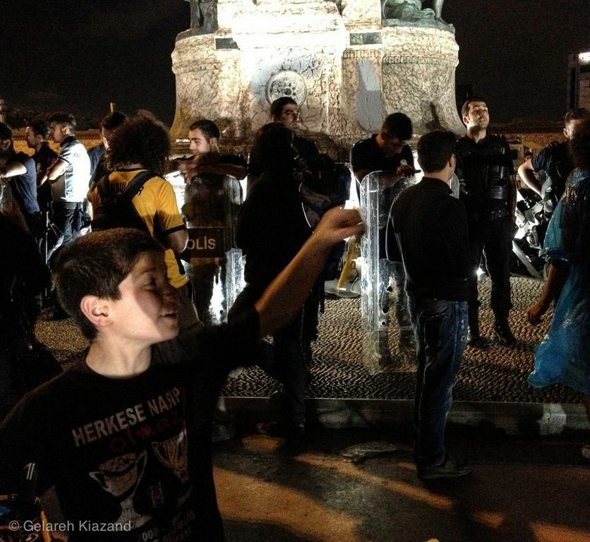 By night, not a single person walked without a mask. The resistance lasted for over 20 hours, and Taksim became like a tulip, with Gezi park its center, as it would close and open with thousands of people either standing fiercely in front of construction trucks and the police or singing and laughing while improving their strategies on handling the next potential surge. That next surge, which came last night, has cleared the park, but the struggle for Gezi Park and Taksim Square is far from over.