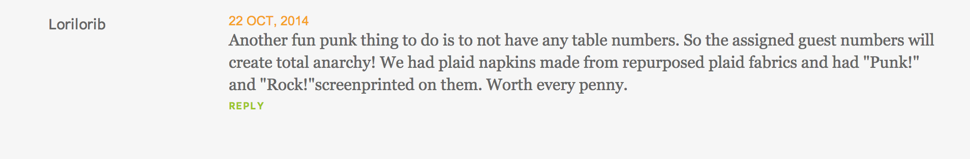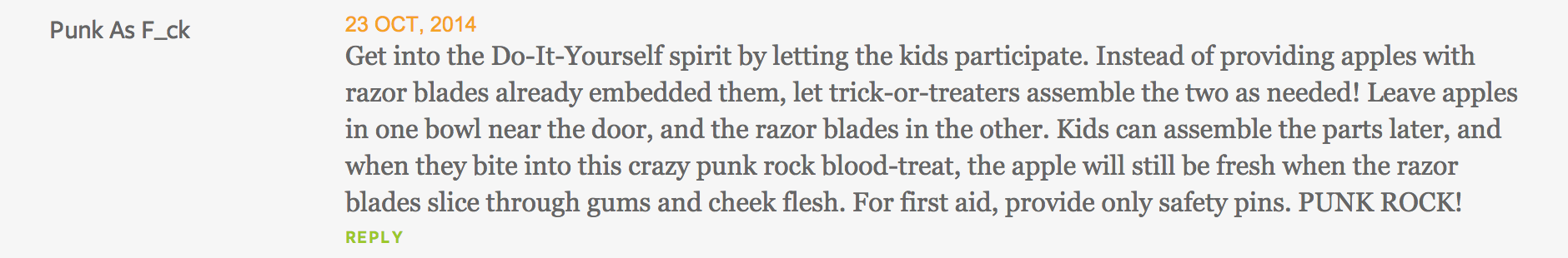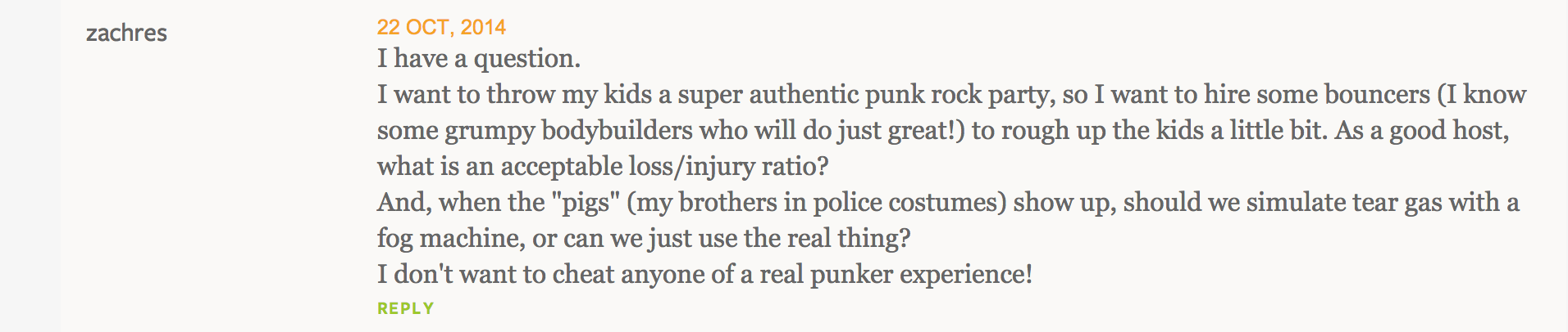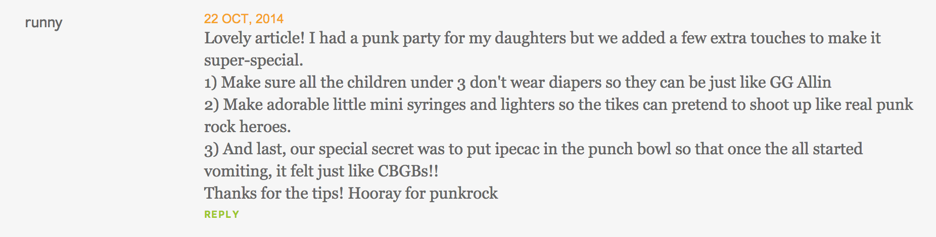 Churchill’s article was steeped in punk culture. It mentioned all the punk things! Like The Ramones and Blondie and mohawks and, uh, garlands. It also suggested that parents prepare “a full on ‘nosh-pit’” for the kiddos, which is actually brilliant and something your author would be very into, a nosh-pit. It was a great article! Then you dweebs had to try to ruin it…