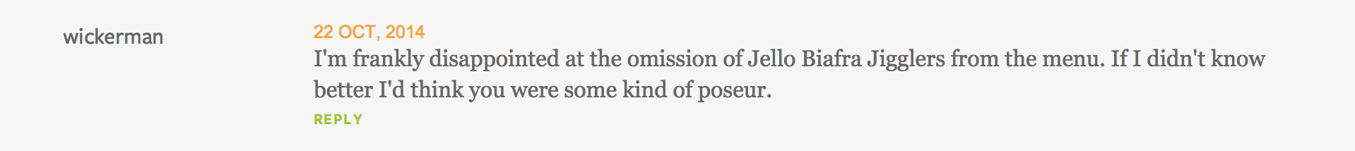 Yeah, well, “wickerman,” life is just disappointing sometimes but that doesn’t mean you have to call Martha Stewart, who would wreck you if you crossed her and do 50 years standing on her head without blinking, a poseur. But also thank you for “Jello Biafra Jigglers,” I love you.
