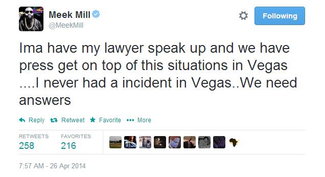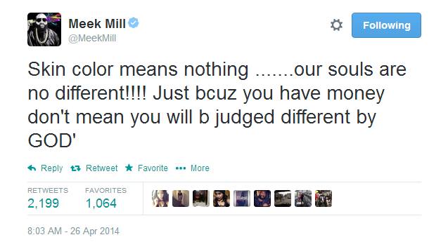 Last night, news broke that Donald Sterling, the racist owner of the NBA's Los Angeles Clippers (as well as racist LA real estate tycoon) was on tape saying some blatantly racist shit to his girlfriend about why he doesn't want her to bring black people to Clippers games or to post pictures of herself with black people on Instagram ("It bothers me a lot that you want to broadcast that you're associating with black people"). A lot of people were justifiably upset, including Meek Mill, who weighed in on Twitter.He then turned his focus to Las Vegas, which, ever since an attempted ban on hip-hop concerts circa 2005, has had a fraught relationship with rap. Because casinos, like a lot of stuff, are run by old, rich, white dudes, who are frequently racist. Anyway, in a week that saw a lot of old, rich, white dudes saying racist shit, shouts out to Meek Mill for speaking out about racism. Fuck racism.