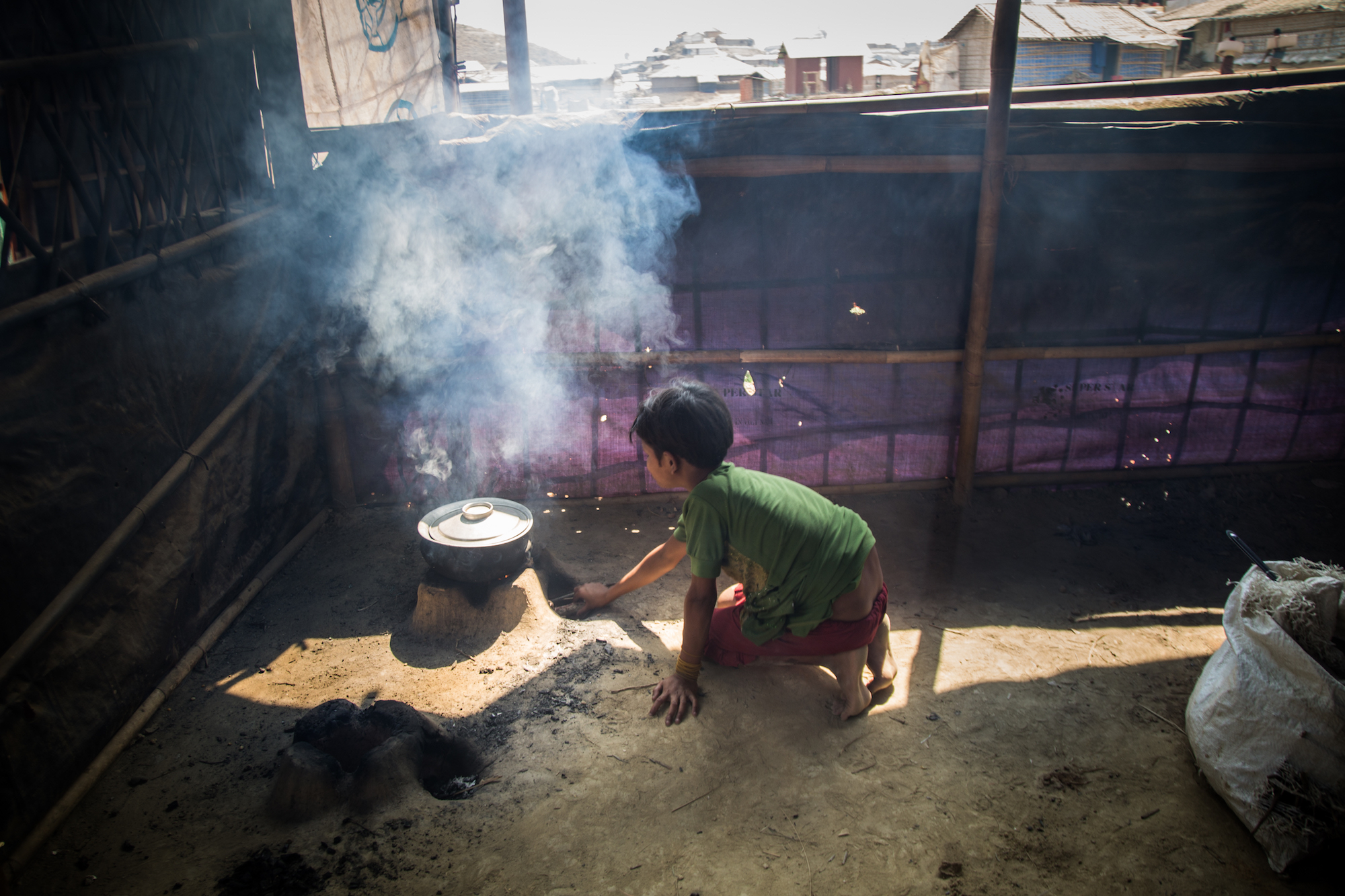 “When my kids would cry from hunger, I would console them by saying, ‘We’re almost in Bangladesh,’” says Amena, stirring a pot of boiling rice in the rari camp’s communal kitchen. “We’ll get food there. They’ll take care of us.”