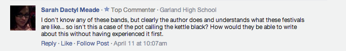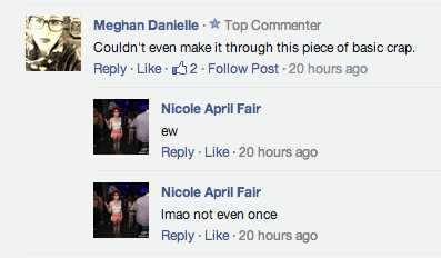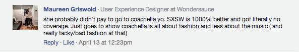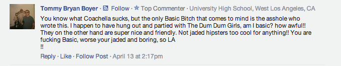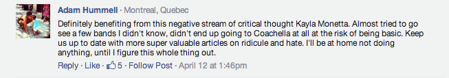 Last week, I wrote an article called âThe Basic Bitches' Guide To Coachella 2014.â A lot of people had a lot of opinions and feelings and thoughts and feelings and feeeeeeeeelings about it. The guide was 100% honest, true, and how I legitimately feel about music festivals and Lana Del Rey being questionably fat. I donât understand why people thought it was hilarious OR âv disgusting.â I am even shocked that anyone would think that this was a satirical piece, because I was being really real the entire time.The Internet was upset/stoked, so I decided to grade their reactions on a sliding scale of: #NVM, #LOL, #SAME, #SUS, or #BRB.Letâs do this.A self proclaimed, âswag ambassadorâ aka Urban Outfitters employee- who, out of embarrassment, later changed his name to âPersonal Penetration Instructor at Go Fuck Yourselfâ took to a war in Viceâs Facebook comment section. Since then, the penetration instructor has removed his comments- probably due to the fact that he made the horrible mistake of saying that he worked at Urban Outfitters, which is basically admitting to having a #deep connection with BDG.