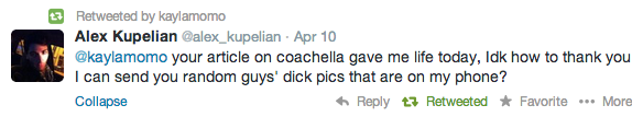 #SUS, #NVM, #BRB, #LOL BECAUSE THIS ACTUALLY HAPPENED AND IF YOU REALLY WANT TO SEE THIS NSFW TWITPIC ITâS HERE.Until next year, basics.DISCLAIMER: IâVE NEVER BEEN TO COACHELLA NOR WENT THIS YEAR. SORRY ABOUT IT. FEEL THE ANGER.Kayla Monetta LITERALLY LIVES for dealing with Internet commenters. She's on Twitter - @kaylamomo--Check out all of our Coachella 2014 coverage that some of the Internet hated:The Cliques of Coachella and Their Opinions of Each OtherThe Hottest Alt-Bros at CoachellaThe Great Desert Hunt For Underbutt at CoachellaCoachella by NumbersWe Crashed Your Coachella PartyThe Bros of Coachella