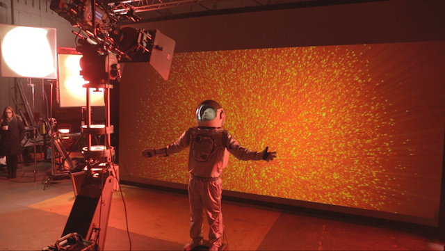 Furthering the connection to a rich history of sci-fi filmmaking, the team developed the spacescapes by drawing them, projecting the images on a backdrop, and then placing model space ships, asteroids, and other physical objects in the foreground and background of the set. The bespoke approach yielded "a very specific texture to the image, something fragile" that feels both modern and sleek, but purposefully rough around the edges.