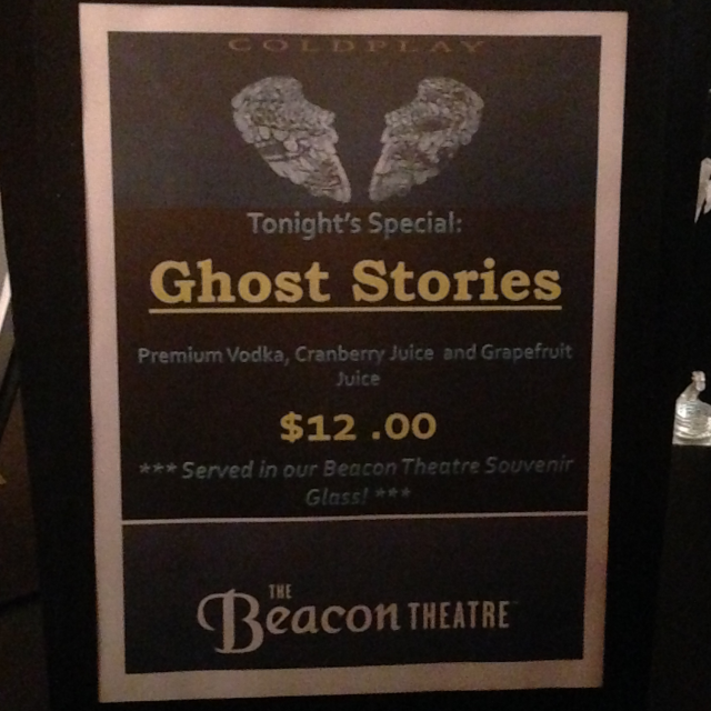 The 50-year-old couple I met last night at the Beacon Theater on New York's Upper West Side, who were celebrating the wife's birthday, certainly would never forget this Coldplay show, the husband's surprise gift. Noah, the 25-year-old Pittsburgh native sitting next to me who lamented not getting to do much in the way of cultural activities since he moved to the city eight months ago, wasn't going to forget it: He even collected some of the confetti Coldplay had shot out afterward, to go with the confetti he'd collected on the Viva La Vida tour. Thomas, the 18-year-old college freshman who'd taken the nine-hour train ride from Pittsburgh (no relation to Noah) just to see this concert, would definitely not motherfucking forget it. He was wearing his light-up wristband and T-shirt from the Mylo Xyloto tour. This was his shit. The guy in the Hawaiian shirt dancing in the aisle and making finger guns at everyone during the quiet new songs nobody knew, who looked like he was in his 60s and quite possibly off the molly water, might end up with little in the way of memories from the night, but nobody was forgetting him.I'll remember Coldplay, but you might have already guessed that. Coldplay is a band that gives more the more unequivocally you buy into them, and, over the last week or so, I've bought into them hard, again. Covering Coldplay's recent promotional stunt of hiding handwritten lyrics in libraries around the world with breathless excitement and jokey enthusiasm, I found myself thinking about the band a lot. I listened to their new single with Avicii, “A Sky Full of Stars,” a lot. I reflected on my own experiences with Coldplay—the unrequited high school crush on the girl who got me into the band, the time I saw the X/Y tour and they blew my mind by letting out a million yellow balloons for “Yellow,” the time when I was recovering from malaria and finally felt healthy enough to sit around on a rooftop looking at the stars and listening to “The Scientist” with some friends, the period when the Jay Z/Coldplay mash-up mixtape was the best thing ever—and there were a lot of them.Like everyone else who saw the Beacon Theater show—their first in support of their new album Ghost Stories—I was having the time of my life. There is no way to appreciate Coldplay that is too lame or cliché. In fact, you're better off being lame and cliché because you're missing the point of Coldplay if you're busy trying to be cool and pick it apart. When I got to the theater, I started taking pictures of the marquee, which is the kind of thing I might normally try to do a little surreptitiously, at the risk of looking like too eager a fan. Fortunately, with Coldplay, there is no such thing, especially if you're rolling solo, just happy to be there, like I was. Everyone else was taking pictures, too. I saw an older couple take a picture of the marquee on their iPad and walk away. They weren't even going to the show; they just really liked idea of it, apparently. When I had the chance to take pictures of anything with the words Coldplay on it, I took that chance. I killed my phone battery taking Vines. And when I had the option to get the night's signature Ghost Stories cocktail, I got the cocktail. Every turn up is a waterfall.