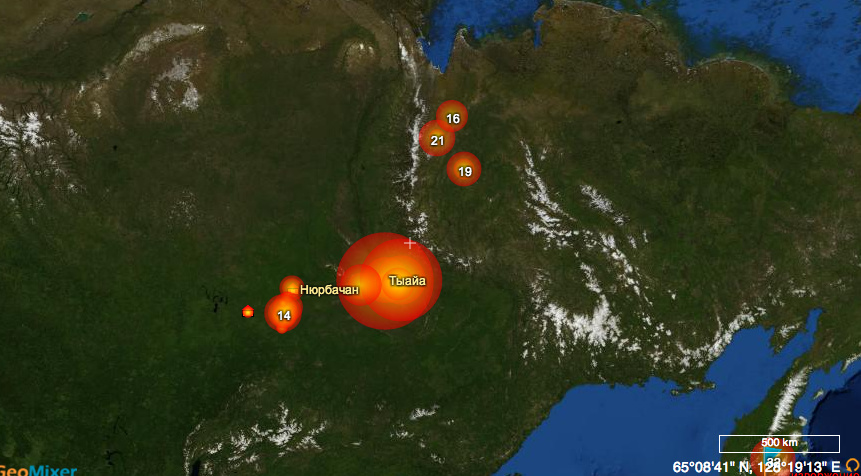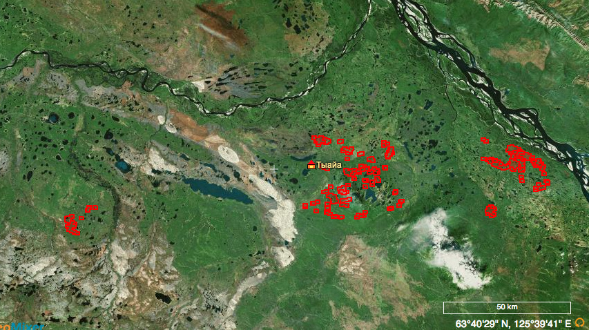 According to a Russian mapping resource, there are a total of nine fires with 85 individual outbreaks in Suntarsky Ulus, the left region in the photo above, and eight fires and 237 outbreaks in Kobjajsky Ulus on the right. To get a sense of the size of the area, here’s a screenshot from the site, fires.kosmosnimki.ru: