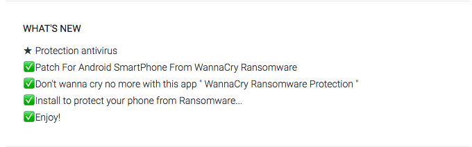 For example, an app called “WannaCry Ransomware Protection” claims to be an anti-virus that can protect Android phones from the ransomware strain. In reality, all the app’s features “are fake,” as McAfee’s researcher Fernando Ruiz wrote, and what it actually does is to display ads and request the user to install even more sponsored apps. In other words, they are adware, software designed to display unwanted and often invasive ads.