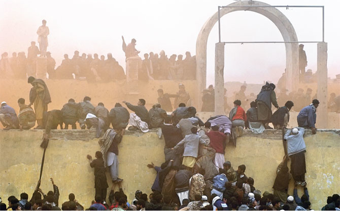 Afghans scale the walls of a stadium to catch a glimpse of the first public soccer match after the collapse of the Taliban regime. The Taliban used the stadium for public executions.
