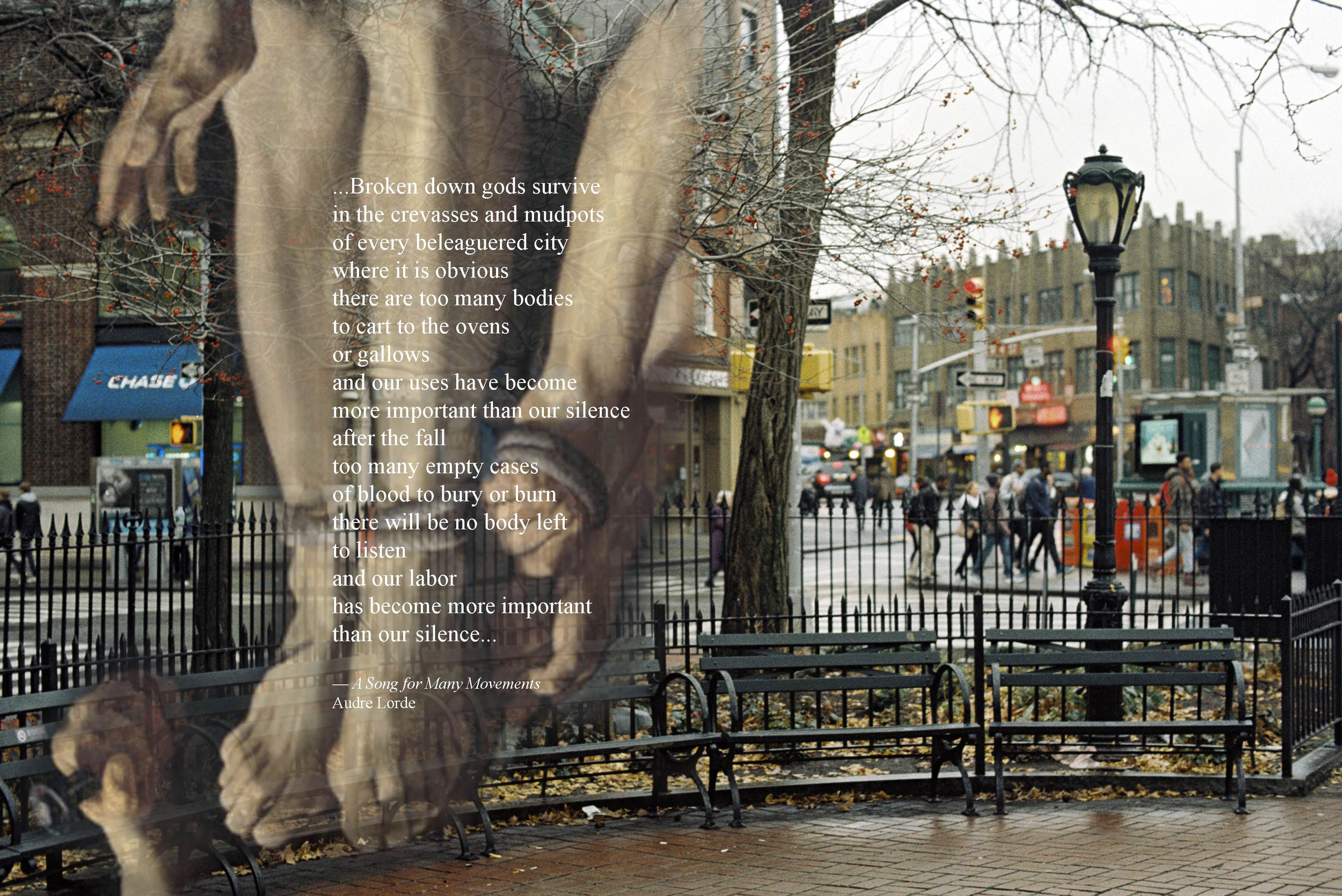 “When I think about the Gay Liberation Monument at Christopher Street Park I think of silence… And I think about the failure to memorialize the lives of the victims of institutional abuse on our own terms. No one used words better than Audre Lorde. Her strategy to transform: ‘silence into language and action’ pointed to the violence, neglect, and erasures of history and gave us the tools to speak up, get empowered, act, and create our own accounts of history. For this piece I chose to ignore George Segal’s figures, pretend they are not there and to give Lorde’s words the power to represent communities that may have been rendered visible yet are continuously oppressed by failed acts of representation.”