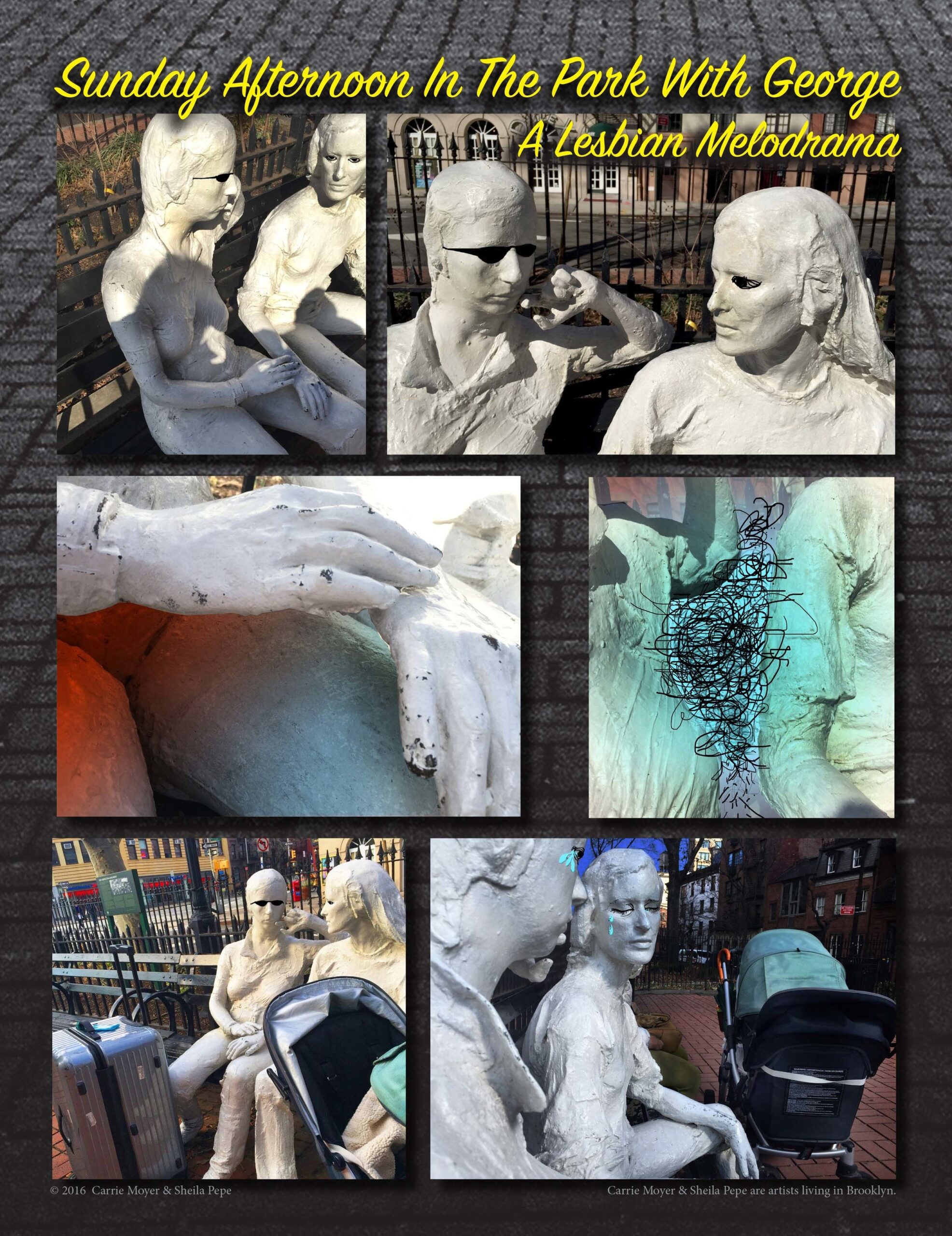 “By definition, public sculpture is the art of the common denominator. Our project, Sunday in the Park with George – A Lesbian Melodrama, revisits the social position of lesbians now that we’ve received a modicum of visibility when we look and behave like everybody else. Now married with an infant and mainstream jobs, our ladies suffer the predictable bumps and bruises of living in the new (New York) ‘village.’ Or are we witnessing, up close and personal, a schism between two women driven apart by the encroachments of heteronormativity into the intimate lives of lesbians and lesbian culture at large.”