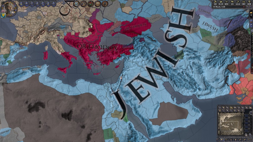 Jonathan: Crusader Kings certainly is unique in that it invokes religion. I must say, much of my mod makes changes and additions to the Jewish religion, though I would not say that I did it because of the importance of religion in the game itself. Religion in my mod is simply a tool through which I deepen the Jewish representation, but my goal is not just to deepen religion, but to deepen the broader Jewish experience (and that just so happens to include religion). However, I find it difficult to imagine what my mod would look like if religion was not an important mechanic in Crusader Kings II. The game takes place in the Middle Ages, so naturally religion is a major factor. And because religion is a major factor in the game, it had to be a major factor in my mod as well.