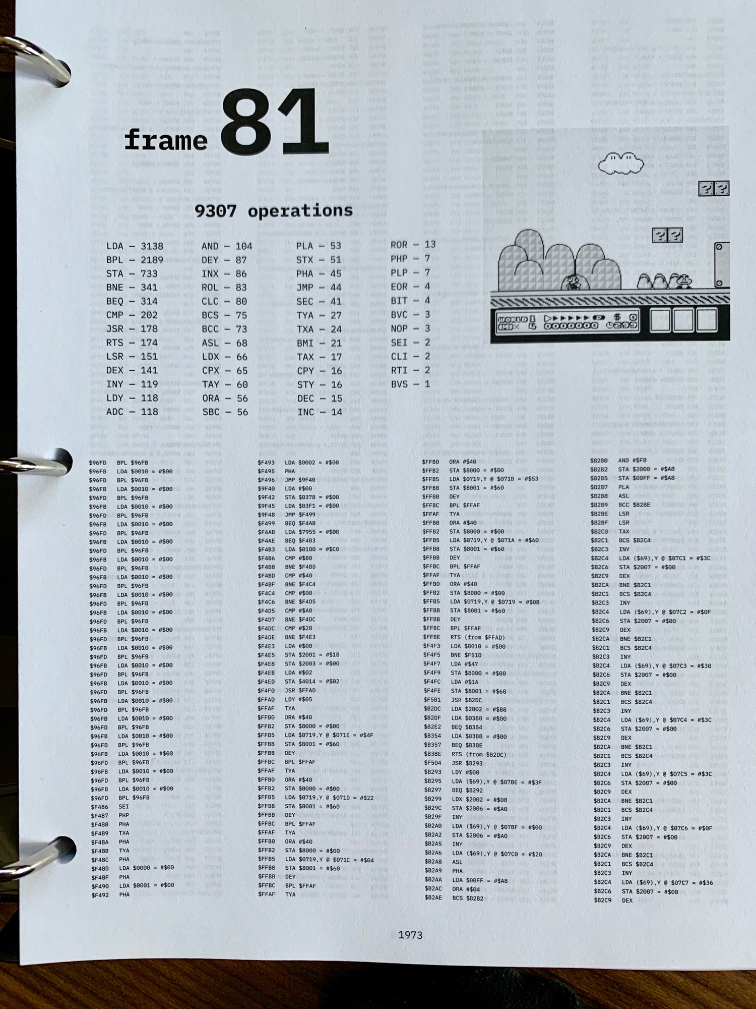 The tome covers the first two seconds comprising 120 frames of World 1-1 in Super Mario Bros. 3. It’s organized by frame, with a picture of said frame acting as a title card before Bierner lists the thousands of operations that go into rendering each individual moment. On average, each frame runs 9,750 operations.