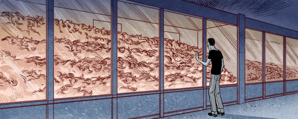 A woman in a hijab and her partner move quickly away from Timmy, as do what look to be a family of Norwegians, blonde blue-eyed types right out of Hitler’s master race catalogue. I follow them out of the hallway and into a stairwell, where a throng of stunned-looking visitors make their way up the stairs.