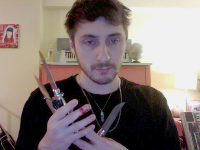 I’ve taken up the unnecessary habit of playing with knives while using my computer. My laptop is surrounded by switchblades and other sharp weapons that I fiddle with when refreshing the page. I’ve accidentally stabbed so many parts of my body and hate myself because of it. While writing the last caption, I cut my knuckle with an official, engraved Hot Sugar knife so here’s an unexpected impromptu selfie.