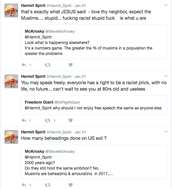 Half of the conversation has now been deleted, but here are @Hermit_Spirit’s interactions with @GSloanMDK. For context, the two other users Padula called a moron in the threat below had been blaming refugees or Muslims for the Quebec shooting.