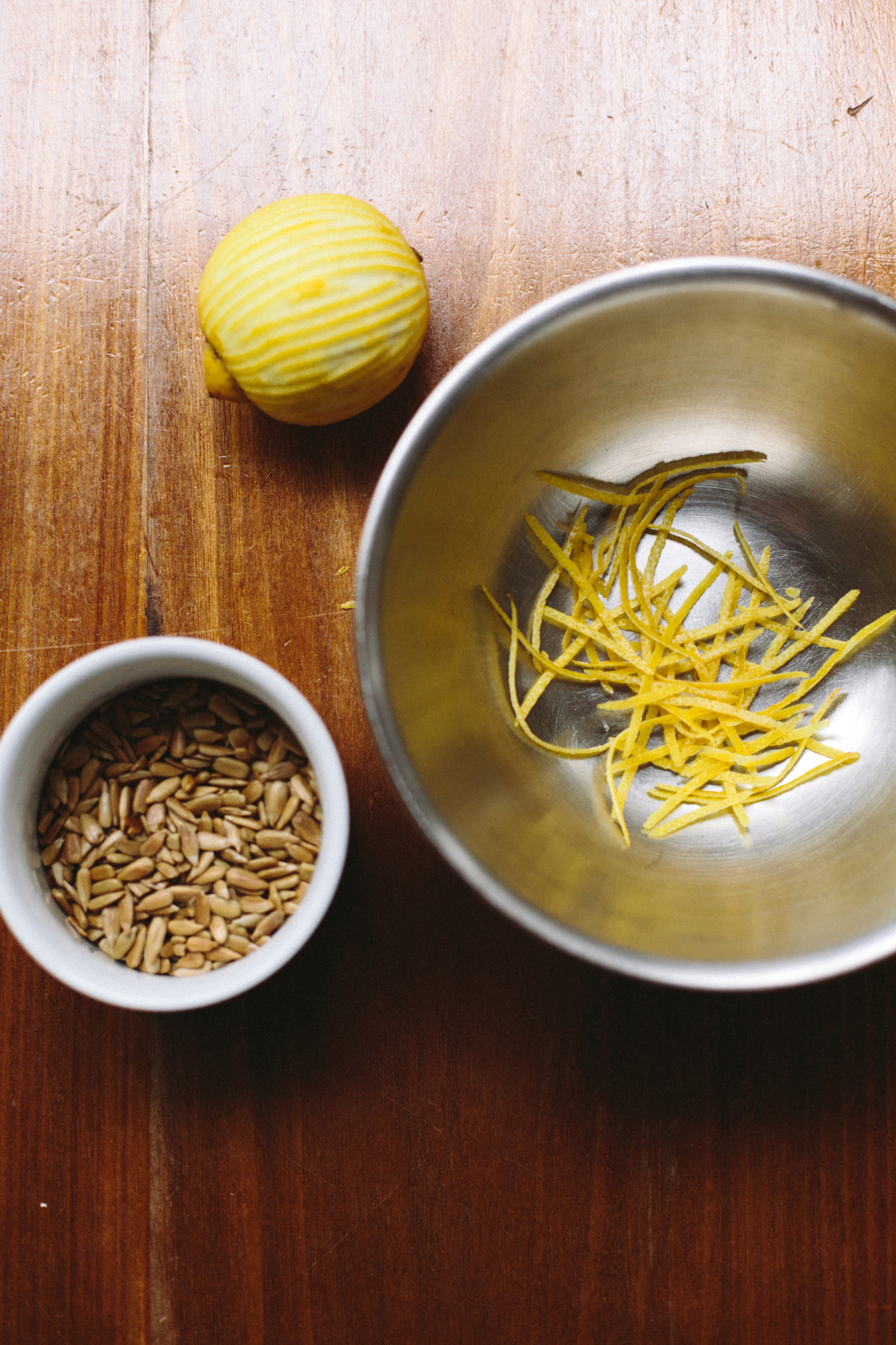 Back to our summer salad and Colquhoun is toasting sunflower seeds and zesting lemons into slim ribbons. She also sets a whole slab of butter to melt for the dressing.