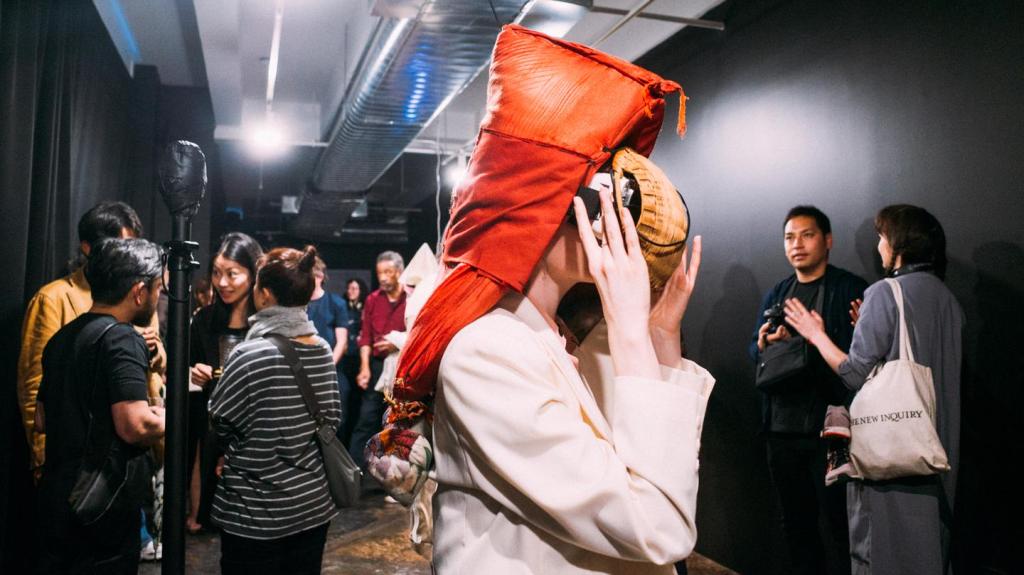 Each VR helmet possessed a distinct appearance and were accompanied by handwritten notes shedding light on their backstories. The helmet created by the artist’s grandmother incorporated a red cushion on top. The note reveals it’s the same cushion she used to protect her head during and after the earthquake that triggered the nuclear spill, as objects fell upon her without warning. Fake persimmons dangled from the bottom of the helmet, which were made by a neighbor who previously grew persimmons, but had to quit after her garden was contaminated in the accident.
