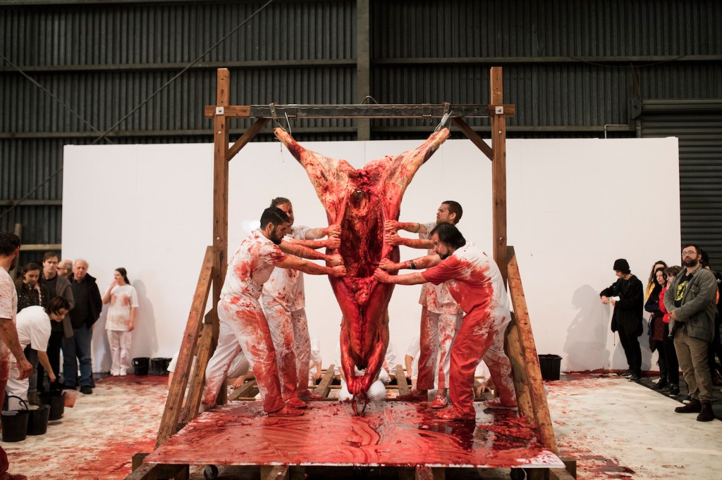 On Saturday afternoon, between the hours of 12 PM and 3 PM, a bunch of people in Hobart tore the organs out of a dead bull and flung them about a shed in a sort of ritualistic playfight. This was art, by a 78-year-old Austrian guy named Hermann Nitsch, who is known around the world for this brand of sexually charged, blood soaked crucifixion theatre. 150.Action, as the piece is called, marked the 150th time Nitsch has staged this particular “action” internationally. But this is the first time it’s come to Tasmania. And many Tasmanians weren’t thrilled.