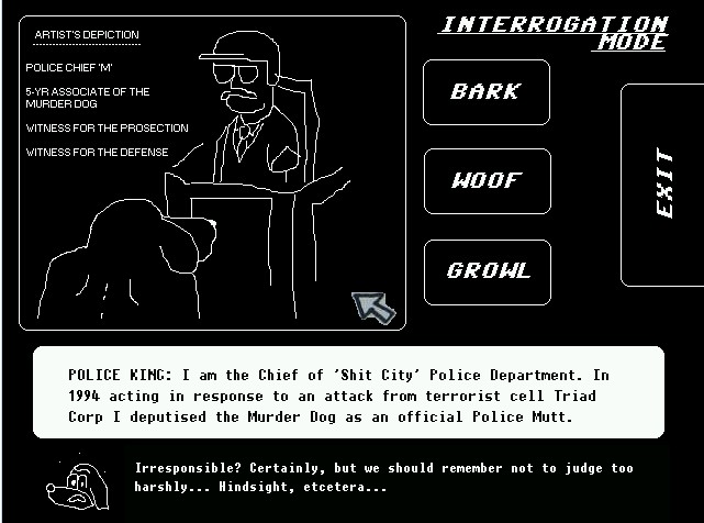 The Trial of Murder Dog revels in the arbitrariness of justice. Like a Terry Gilliam film, Trial takes the core logic of an idea and pushes it to its limit. For instance, there is a photo of Murder Dog clearly tearing someone in half. At the trial, however, the player can argue that Murder Dog was simply putting the person back together. There’s no way of knowing, and within the structure of state justice, that’s as valid as any other argument.