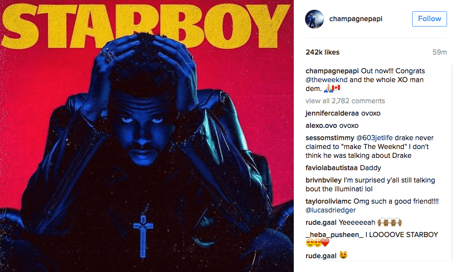 The Weeknd’s Starboy album just came out, and it’s a welcome expansion of Abel Tesfaye’s coked-out grace with disco and new wave. Among those congratulating Tesfaye was none other than Drake, who dedicated a full post on his Instagram to the album release. Even though the history between the two has been rocky, Tesfaye salutes Drake in return.