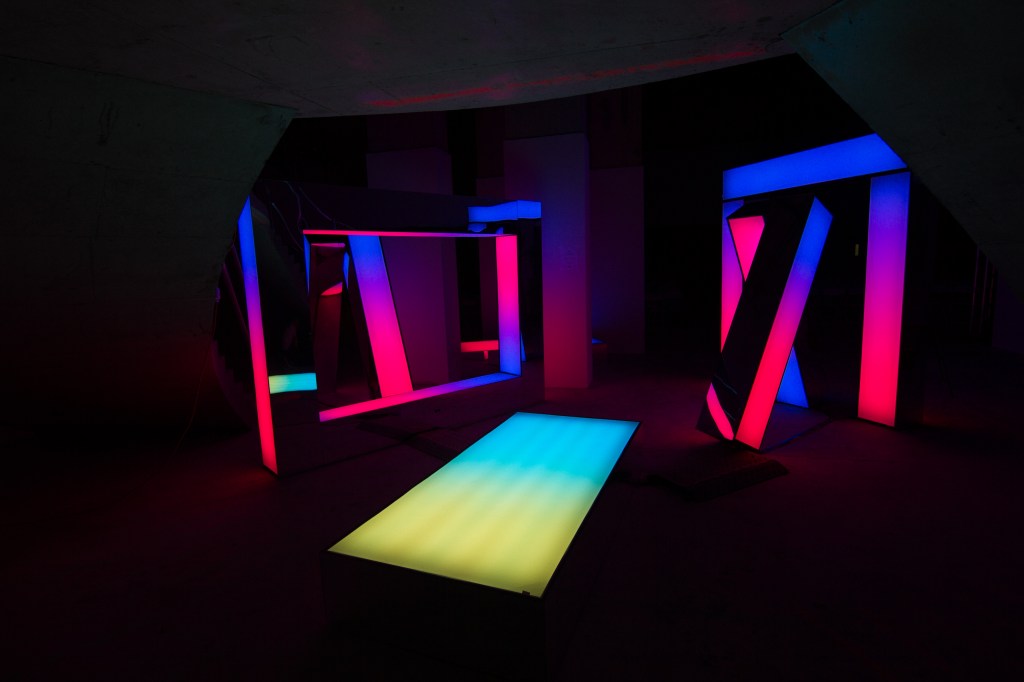 The installation was housed in the bottom floor of the Williamsburg Hotel, just behind the TNT content stage. Oddly shaped and teeming with neon-hued, programmable LED light, this immersive light experience was added to the Northside Festival after it was created as part of the art program at this year’s SXSW. A modular design, the pieces that comprise the setup are all rearrangeable, and so displayed according to the space it is inhabiting. In the case of Northside, several structures laid flat on the ground, while others stood upright, angled and somewhat off-kilter. There were also mirrors, which reflected neon lights programmed on “a loop that would change every few seconds” with varying degrees of color and brightness.