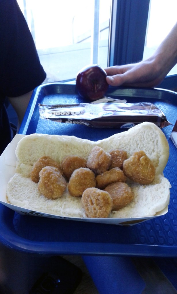 As it turns out, the offending meal was served at Pennsylvania’s Hempfield Area High School and pawned off as a “Popcorn Chicken Po’ Boy Sandwich.” Kudos for naming creativity, but we have to assume that the people who write the school menu are not the ones doing the cooking. The meal—topped off by a sad-looking apple and a Hershey’s Scooter Crunch ice cream bar—was allegedly being sold for $2.75.