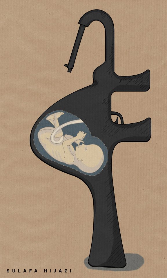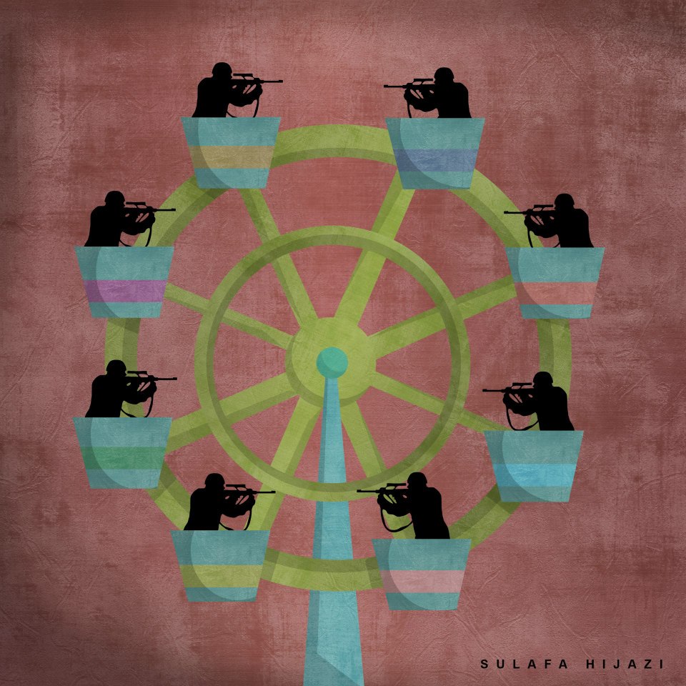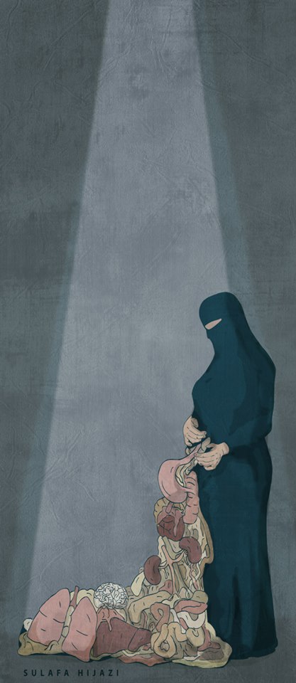 In 2011, the Arab Spring enabled Hijazi to speak out against the military-regime. Her illustrations challenge violence, the military and toxic masculinity. They are unapologetic.
