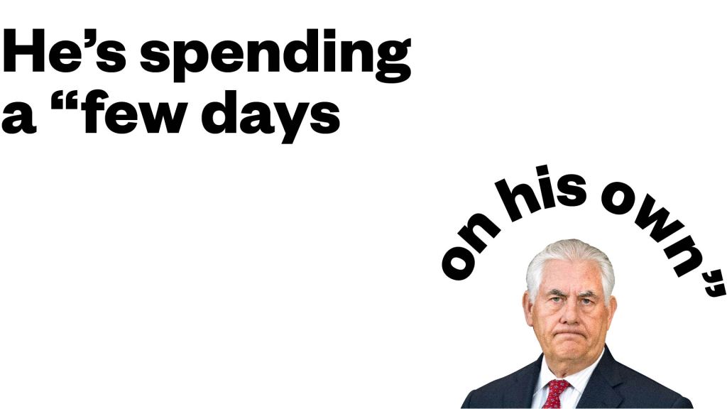 Though Tillerson’s State Department has been remarkably close-mouthed about his activities, recent reports indicate Tillerson has carried that resigned attitude with him to his new position — in March, he cut short a trip to South Korea citing “fatigue,” skipped an annual press conference on the State Department’s human rights report, and has reportedly isolated himself from dealing with anyone outside of two trusted aides who act as gatekeepers for his office.