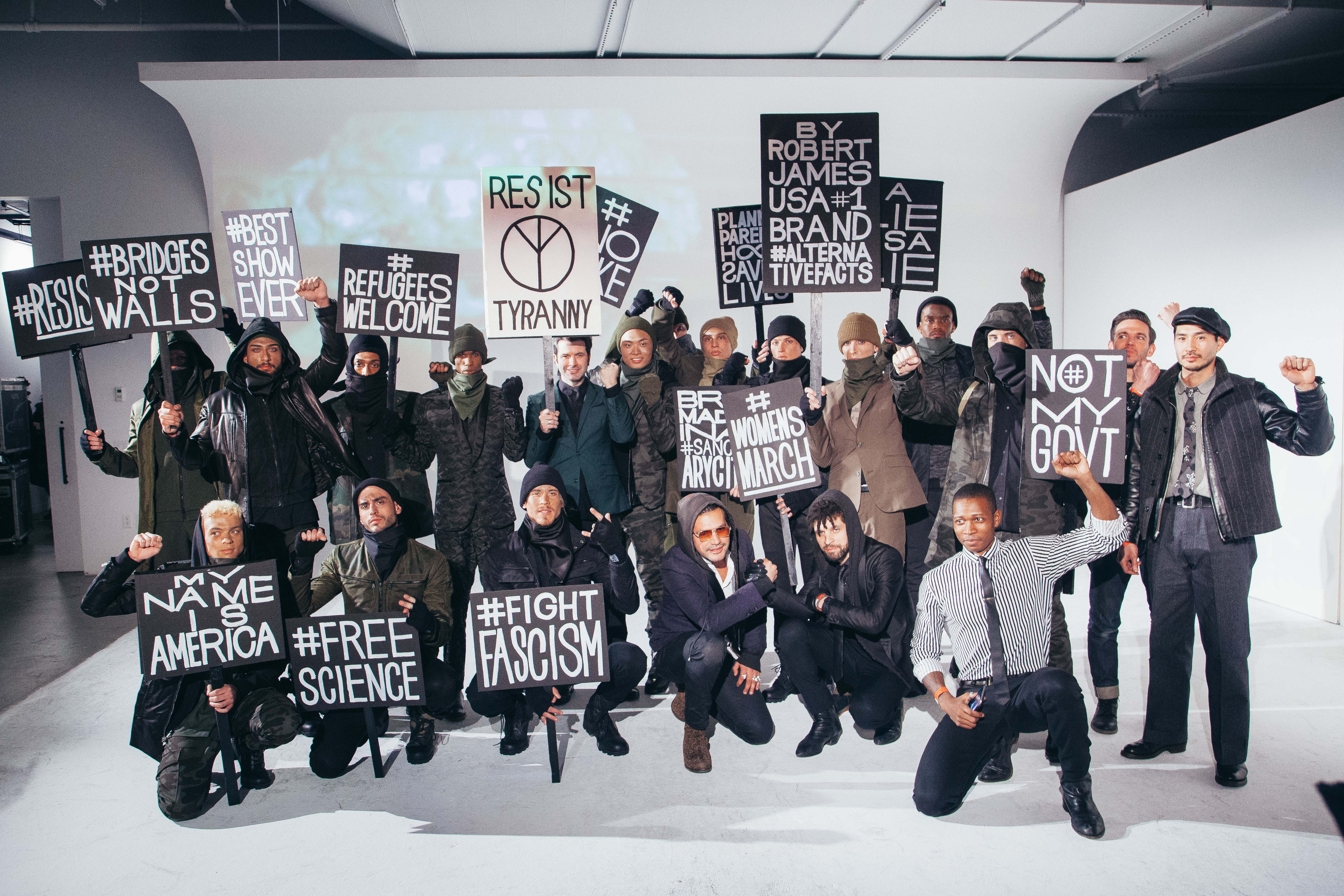 It seems appropriate that designers would mine this approach today, considering a former reality TV star who grabs women “by the pussy” is the leader of the free world and we’re in the midst of the gravest global refugee crisis since World War II. At By Robert James, models held signs that said things like “#resist,” which was an obvious shot directed at President Donald Trump. Another sign read “#refugeeswelcome, likely in opposition to Trump’s travel ban. Although the spirit of this show aligned with Simons’s “Fear Generation,” the Ohio-born, Fashion Institute of Technology-trained designer’s collection featured sharper silhouettes with business-like attire like tailored blazers in camo, styled with black hoodies and fingerless gloves.