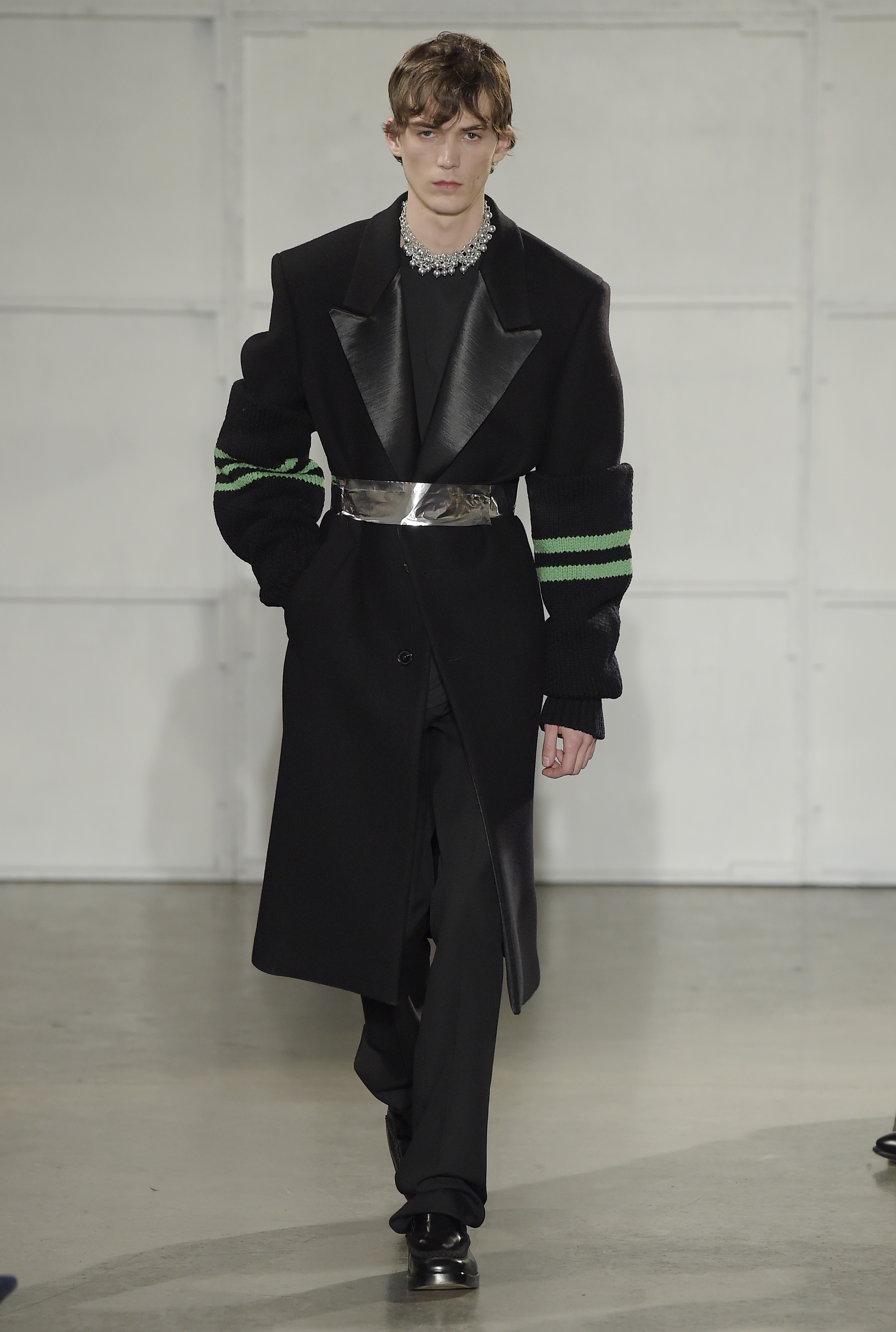 But this season, for his own collection, Simons didn’t seem militant at all. As a somewhat oblique address of the political situation, at his Gagosian Gallery–hosted runway show, the designer sent out models wearing garments bearing the phrase “I [heart] New York” standing in contrast to the hate that had been propagated by the current president. He also cinched overcoats with duct tape bearing phrases like “walk with me” and “youth project.” While that styling trick felt fresh, it didn’t distract from the most covetable looks: satin overcoats paired with luxurious oversize trousers.