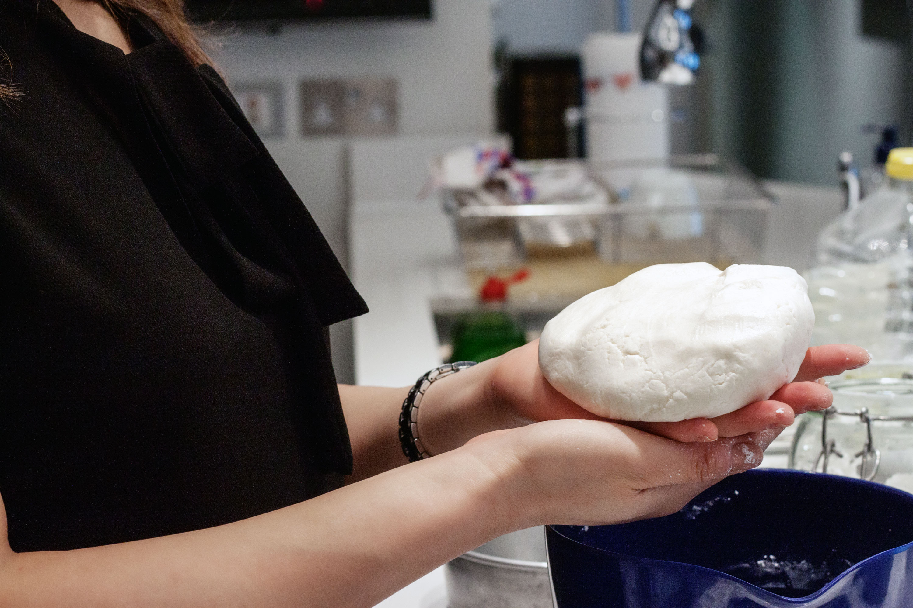 I’m here to find out how to make mochi and to understand more about Q texture in the process. The recipe is surprisingly simple: rice flour, sugar, and water. Wong makes a simple dough and let’s me prod at it.