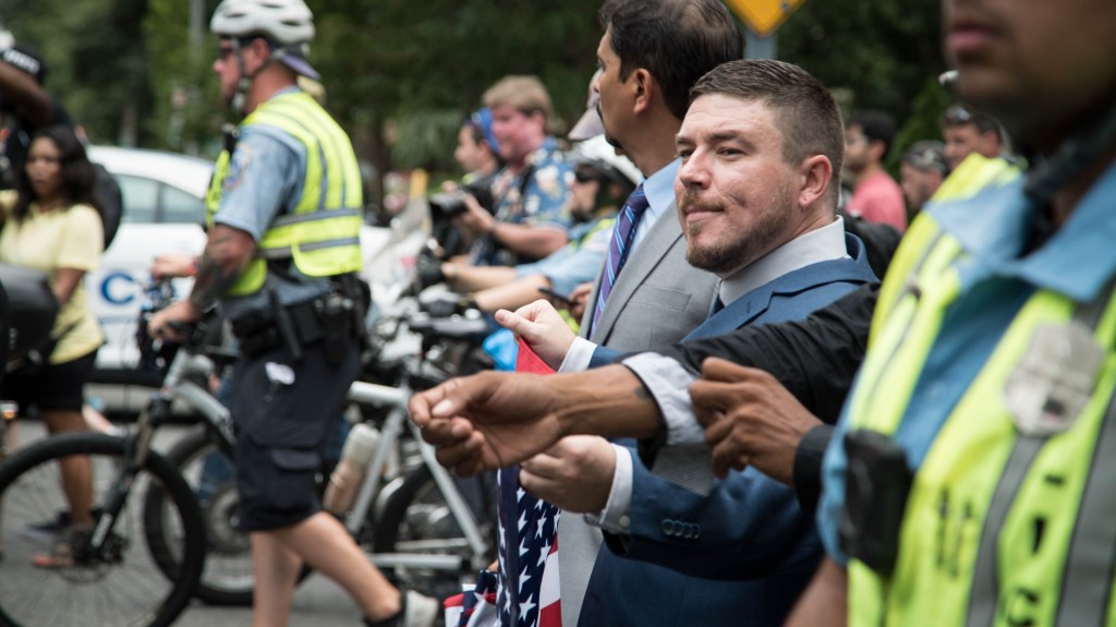 An effort to clear protesters resulted in scuffles: protesters hurled multiple firecrackers in the direction of the police, and accused police of prioritizing the safety of white nationalists over D.C. residents. Police backed off, and ultimately escorted Kessler’s group via an alternative route.