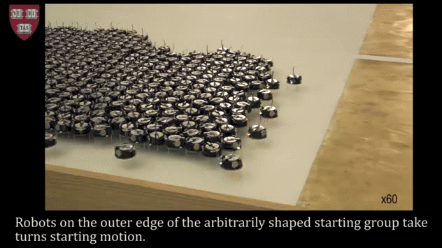 A major part of the breakthrough comes from an algorithm Rubenstein and his research team developed to circumvent the flaws of the exceptionally simple robots. Under the power of the Harvard team’s coded instructions, the Kilobots can work together to correct traffic jams and incorrect positioning. Using the infrared communicators, they work outward from four designated origin point bots, conforming to a simple 2D image. They use simple functions—i.e. following the edge of a group, tracking their distance from the origin bots, and maintaining a sense of relative location, herd behavior-style—to slowly troubleshoot their way into forming the desired shape.