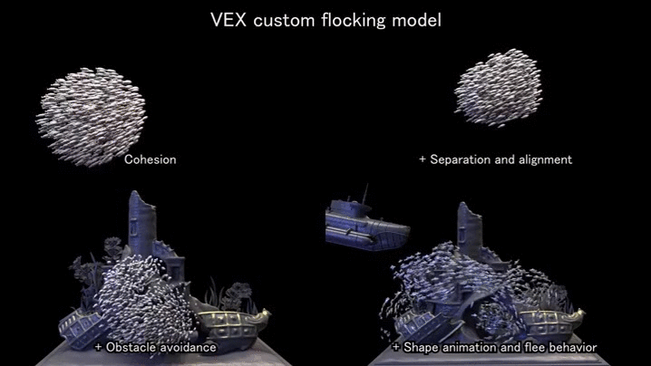 Crowd simulations take over the ocean floor in Memukhin Oleg’s Fishing day, a brief but beautiful CGI experiment. In just six seconds of animated action, Oleg (a.k.a Monkibase), simulates the fluid behavior of fish using a “fish flocking model” created in the graphics application Houdini. He sends the school of sea creatures through four stages of movement: cohesion, separation and alignment, obstacle avoidance, and flee behavior. As a submarine powered by Oleg’s gloved hand swims past the school, the miniscule CGI fish weave in and around an underwater shipwreck in perfect unison.