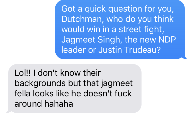 If you’ve ever seen a street fight you know that the dude who isn’t fucking around is going to win nine times out of ten. So, with that in mind, Jagmeet “Doesn’t Fuck Around” Singh, is our winner.