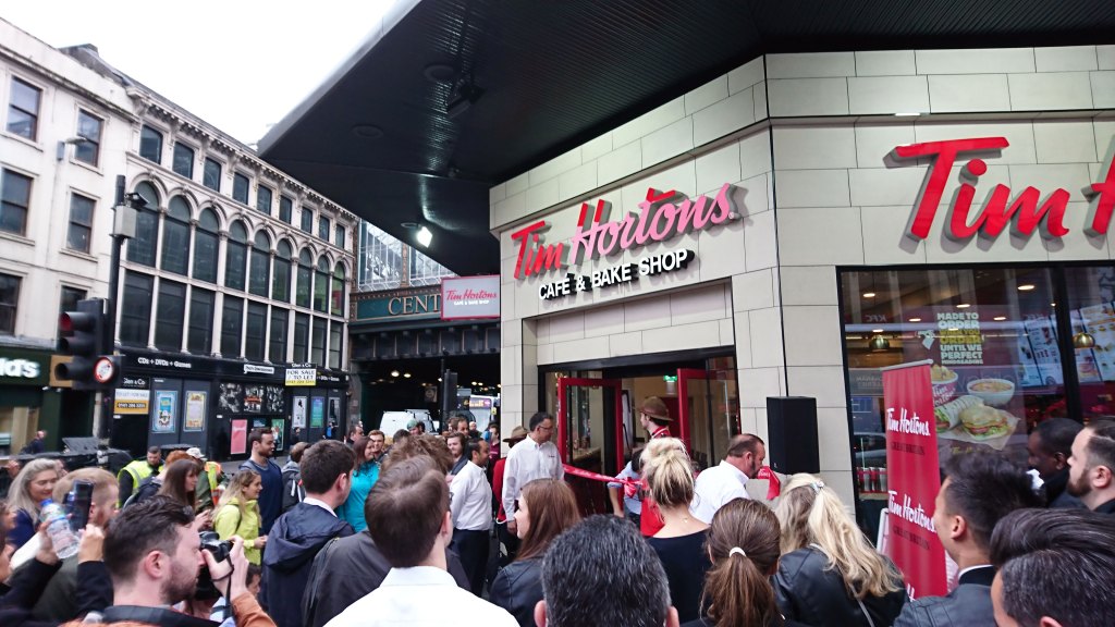 The opening has been teased for months with stories in the local press and an expeditionary Tim Hortons van that doled out doughnuts and muffins to university students recently sitting exams. By the time launch day rolls around, the people of Glasgow are buzzing on a high worthy of Hortons’ signature Double Double coffee.