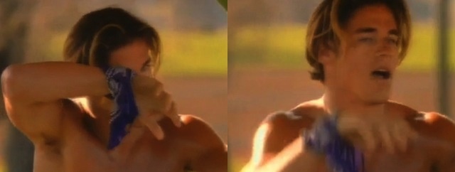 Although maybe this next scene explains it: I guess if you’re riding around in your car topless, having what is commonly known as a Bra Drive, it would be handy to have a spare couple of tops on the seat behind you that are just one backwards grope away. (Look-Mom-No-Hands-Bra-Drives are not encouraged, but you know, these two are R-E-B-E-L-S.)
