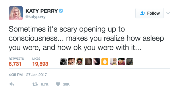 Katy Perry recently changed her Twitter bio, which—I can’t even believe I even have to tell you this—is a huge event. It now sharply reads: “Artist. Activist. Conscious.” Bold! Katy Perry has either gained sentience, or she is on the Woke Train. Celebrities these days see what kind of social justice event or activity they can insert their brand into. Perry is not immune to this but, despite the foolish ways some have attempted to be socially and politically conscious, she is still striving for some good here.