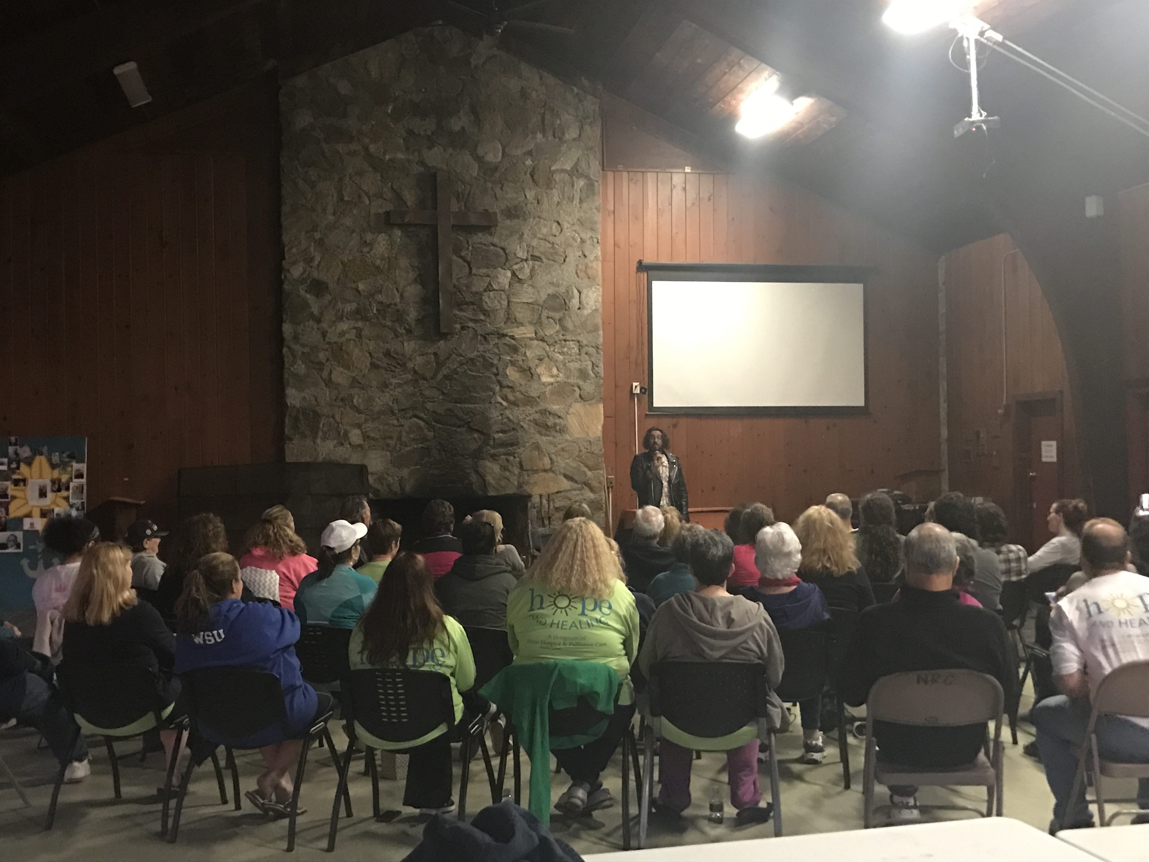 The comedy slot, from about seven to nine, is just one of many activities at this community-building event. Truly, it’s cope camp, and it’s both overwhelmingly positive and depressing: There’s zumba, a clay workshop, yoga, meditation, kayaking, a medium, and lectures on loss, self-compassion, and comfort.