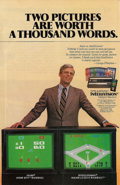 The computer component had the effect of putting Mattel’s device on a higher plane than the Atari VCS in the eyes of the public, which appeared to be the company’s marketing goal. (The company also used Mid-Atlantic-accented George Plimpton to market its sports games, which is a great way of telling the pubic that you’re classier than your competition.)