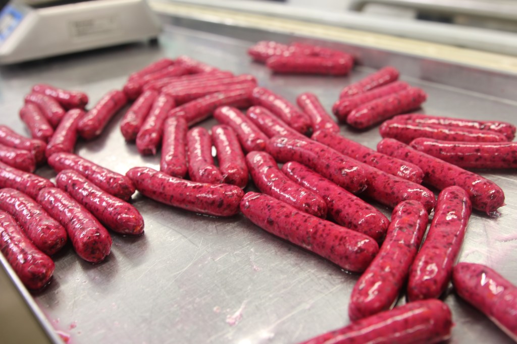 The finished sausage mush (official term) is then poured into individual sausage skins made from seaweed-based gel, rather than the traditional pigs’ intestines. The sausages are crimped into shape and sent off to be weighed, packaged, and transported to the supermarket.