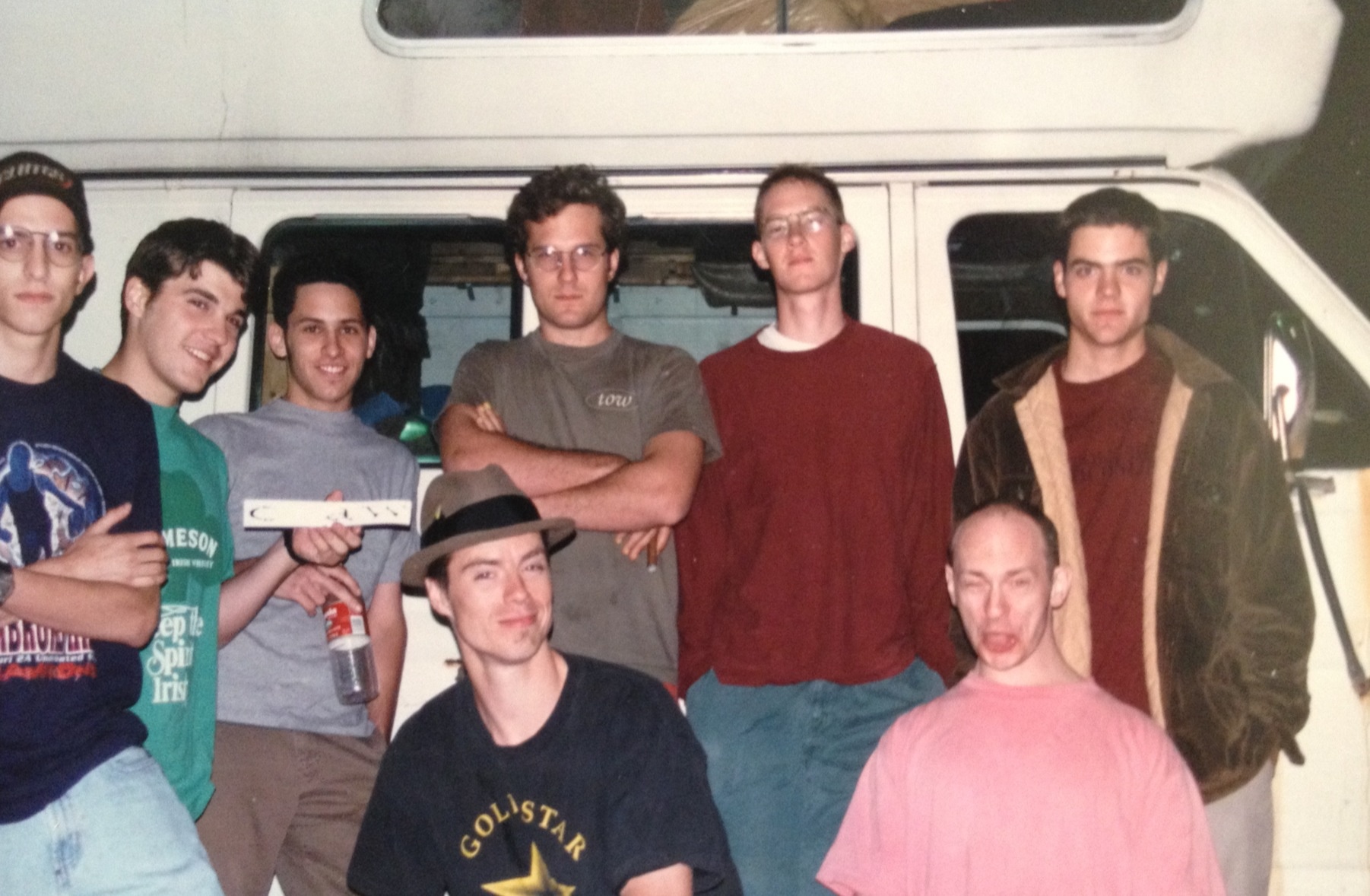 Photo: the author, third from left, with a few of his closest friends and four fifths of Craw (including Will Scharf, second from right, mugging like a wackjob), in Lawrence, KS—1997.