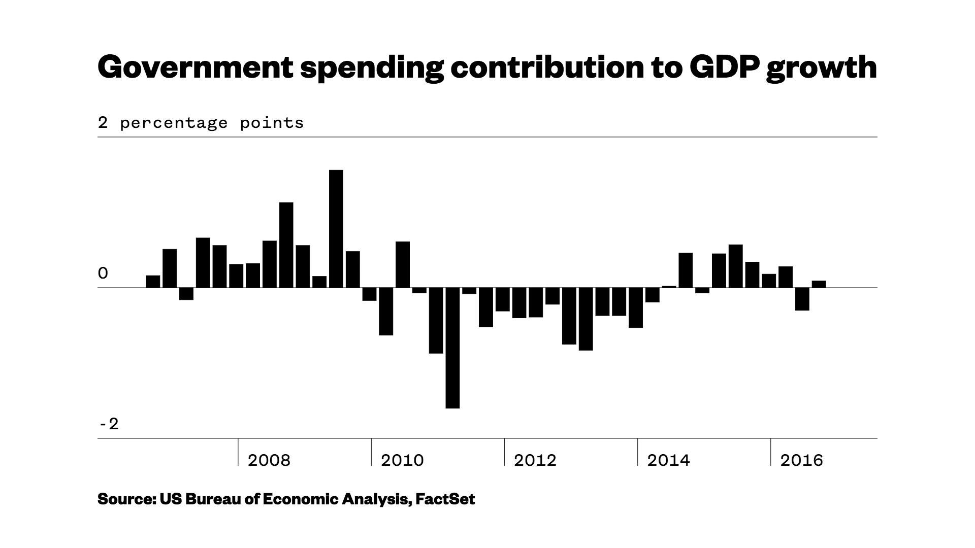 Macro-economically speaking, President-elect Donald J. Trump’s professed willingness to throw decades of Republican rhetoric about fiscal conservatism out the window is exactly what the U.S. economy needs.For years, the economy has needed additional government spending—either through direct government spending or tax cuts—to push economic growth higher. (Even the IMF, where government spending was long anathema, has come around to the idea in the face of persistently sluggish global growth.)Under President Barack Obama the Republican-controlled Congress made that impossible. Republicans maintained a relentless focus on shrinking the U.S. deficit, driving the country to the brink of default over once-routine regular decisions to raise the U.S. debt ceiling, for example. That kept government spending very weak in recent years.