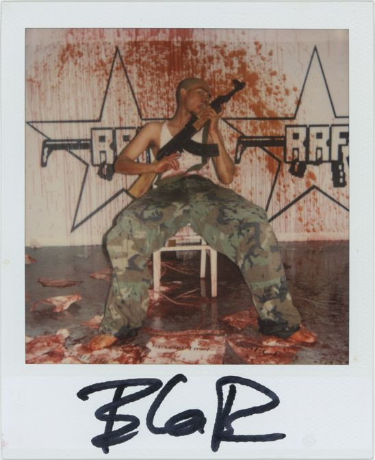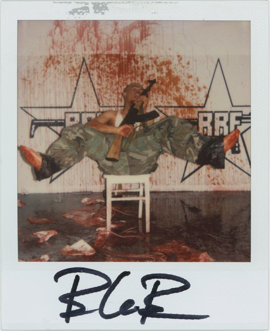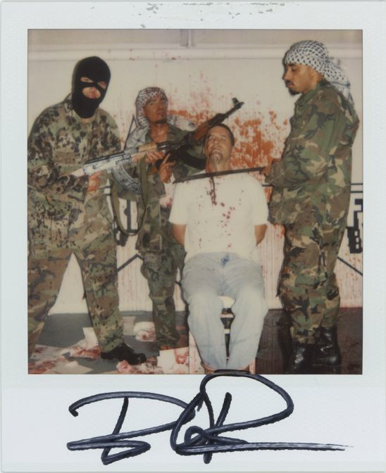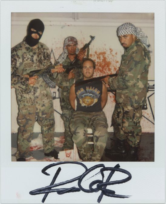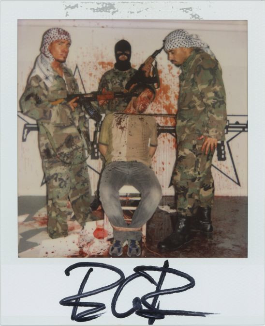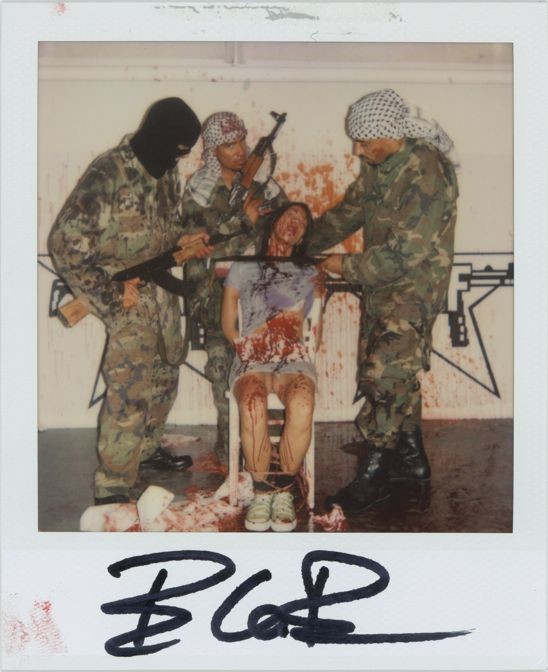 Later, I presented these strange artifacts, plus those of three similar subsequent events that I participated in over the last several years. The series you see here was part of a performance at the opening of my art exhibition “Heterosexuality Is the Opiate of the Masses” at Peres Projects in Los Angeles in 2005. The idea was to recreate the hostage videos and photographs that we often see on news outlets, and in so doing to allow people to experience what it might feel like, if only for a moment, to be in that horrible position. The participants had the option of posing as they were or spattered in blood, and once again I took two polaroids, one that they could keep and one for my archives. I was trying to explore the way that the news media invariably presents such lurid artifacts as abduction videos as titillation and entertainment for the masses.