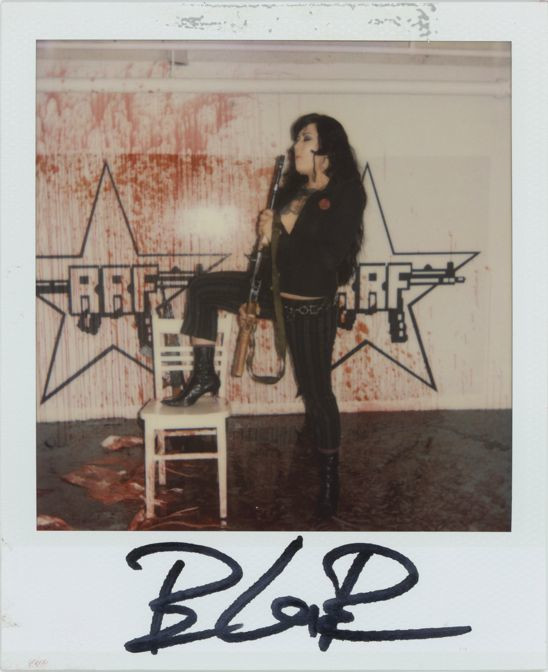 After the shoot, I invited the throngs of people who attended the event to enter the bloody room and pose on the bed for a polaroid, providing them with the choice of either a machete or a rifle as a prop. I charged them five dollars to cover the cost of the film, which is expensive, and took two polaroids of each subject, letting them have one and keeping the other for my archives. I was surprised how thoroughly people inhabited the role of victimizer or victim (with couples it was interesting to see how they negotiated who would play which role), and how gleefully and pleasurably they participated in the violent scenario.