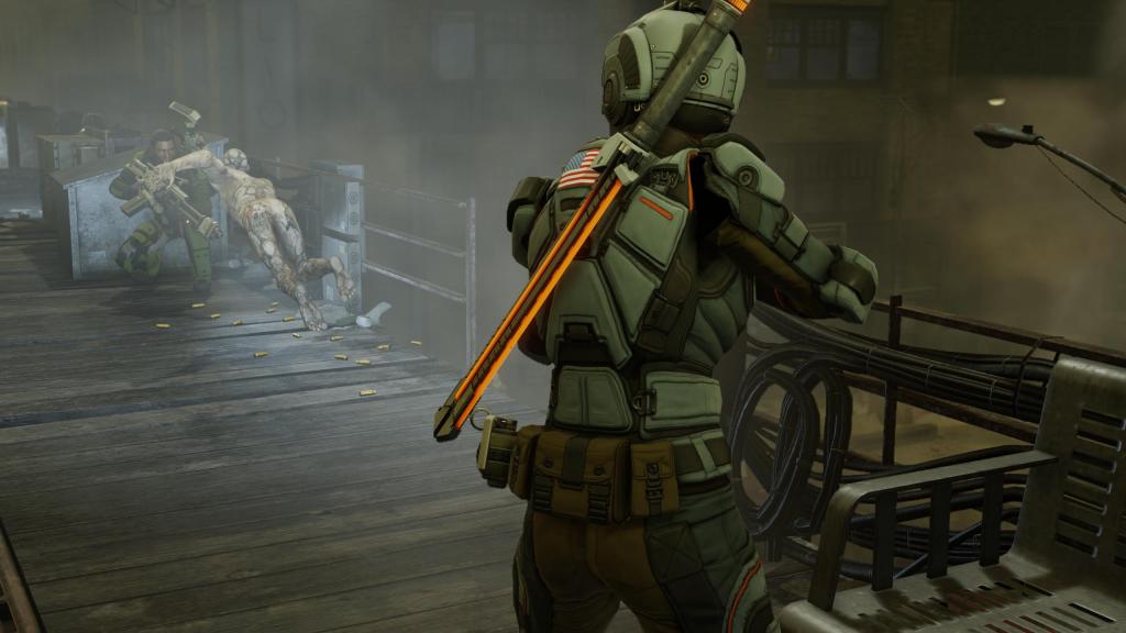 One moment, among many: I’ve got six XCOM operatives lined up like a firing squad on top of an elevated train track above a ruined cityscape, where the ashen remains of the dead are still frozen in place from some alien weapon that was unleashed against them. Every turn chalk-white zombies come boiling out of the long alleys, drawn by the sounds of battle, and every turn my squad roars to life, with machine gun and rifle fire scything down most of each wave. As a few trickle through, it’s a 50/50 chance whether they come after my squad or the alien troops on the street below, who are fighting their own grim holding action against “the Lost”.