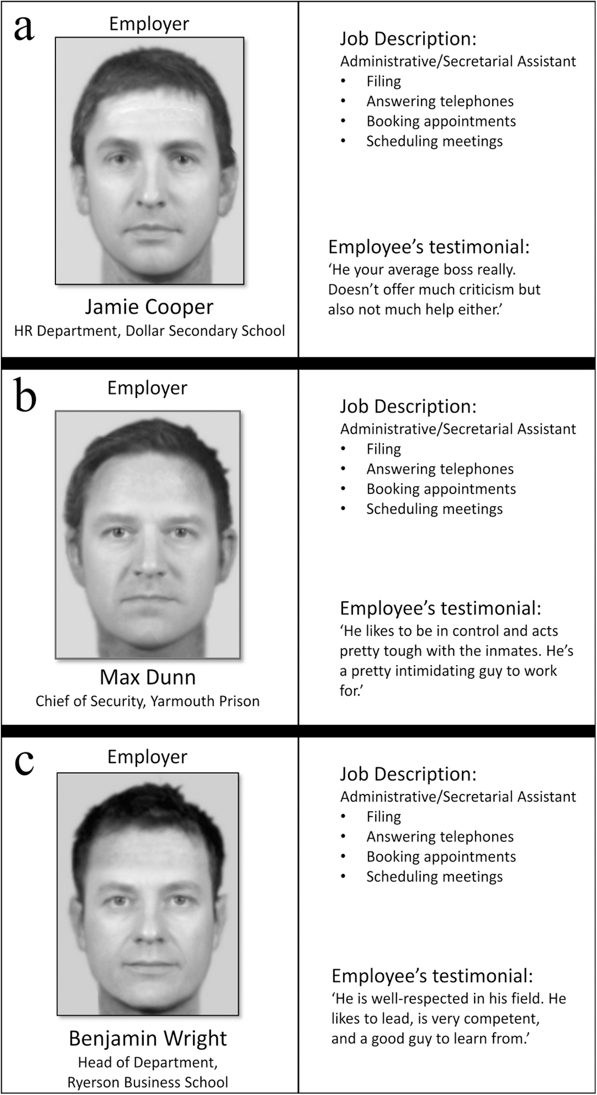 Participants were presented with an image, name, and job title of an employer as well as an employee testimonial, which were all fictitious. They were then asked to answer several questions. There were three employerstotal and their images were specially created using a program called EvoFit to look dominant or prestigious. Later we got these images rated by a different set of participants and picked the ones that were rated very high in dominance or prestige. We also picked one that was rated quite low on both of these traits, and this became our “neutral” employer.